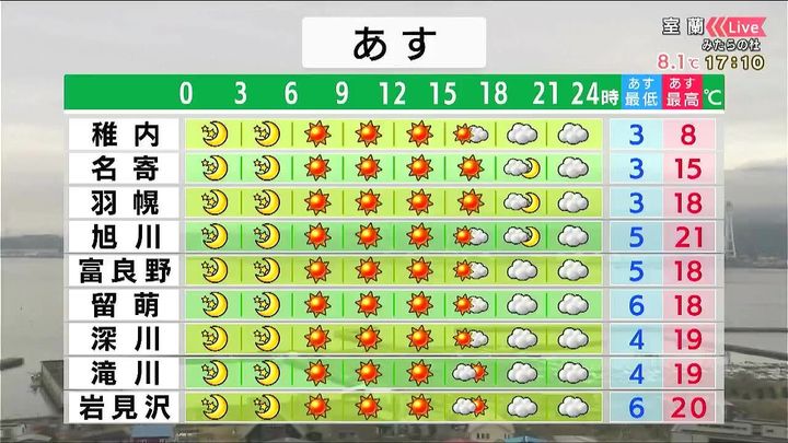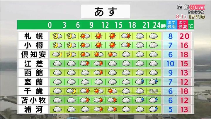 あす24日(木)の時間ごとの天気。道央・道南からです。