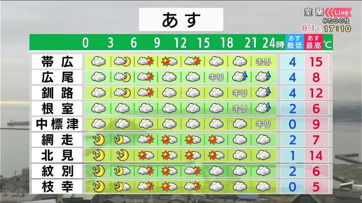 道東は雲が広がり、夕方以降、小雨や霧雨が降るでしょう。オホーツク海側は日差しが出ますが、紋別の最高気温は6度、道北の枝幸は5度と寒さが戻ります。