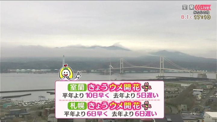 きょう23日(水)、室蘭と札幌でウメの開花が発表されました。ともに平年より早い開花となっています。どんどん花の季節を迎えています。