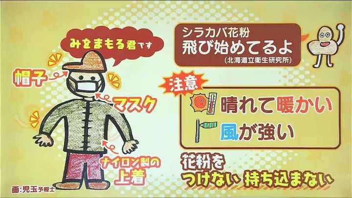 道立衛生研究所によると、各地でシラカバ花粉が飛び始めているそうです。帽子やマスク、ナイロン製の上着などで体に花粉をつけない。そして、上着をはらってから家に入るなど家に花粉を持ち込まないことが大切です。