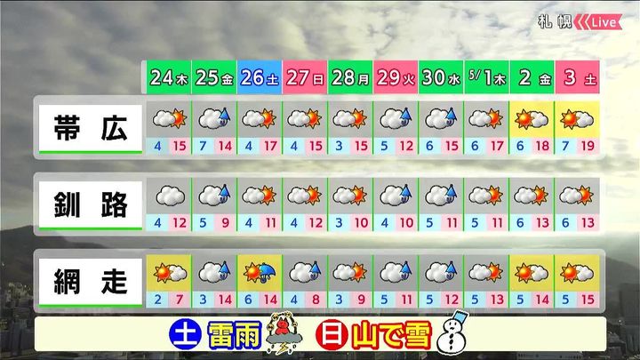 オホーツク海側で土曜日は雷雨のおそれがあり、日曜は内陸でも雪がまじるため、路面凍結に注意して下さい。帯広と釧路は日差しの出る日が多いでしょう。