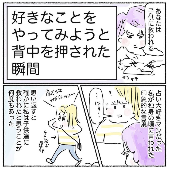 こんにちは!4児の母で漫画家兼公認会計士のAyumiです。今でこそ、日々の暮らしを漫画に描くのをお仕事にしていますが、かつては絵に全然自信がありませんでした。それが変わるきっかけになったのは「占い」と「子ども」だったんです。自分の生み出すもので、人が喜んでくれることがわかったとき、人生がガラリと違うものに…!詳しくは、漫画をご覧ください♪