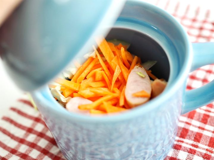 そしてマグを電子レンジに入れて500Wで約4分、さらに200Wで約7分加熱したら取り出します。そのまま10~15分蒸らしたら完成です!