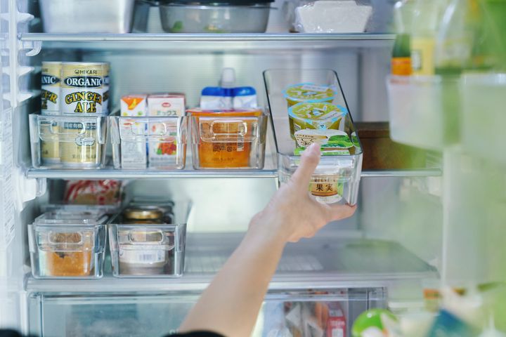 IKEAで購入した透明の仕分けケースに、ジャムやヨーグルトなどを入れた洋食セットと、納豆や漬けものを入れた和食セットを冷蔵庫に常備。ケースごとテーブルに出せるのがとても便利なのだそう。