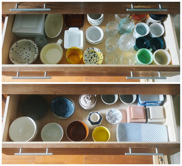 食器は料理を選ばないデザインを厳選し、和食用、洋食用を引き出しの別々の段に収納 。食器選びで悩まずにすむうえ、数が少ないと出し入れがしやすく、片づけもスムーズにできます。