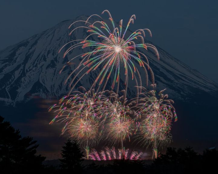 見てください! 日本一の富士山と花火の共演。まるで絵のような、なんとも贅沢な景色でしょ!