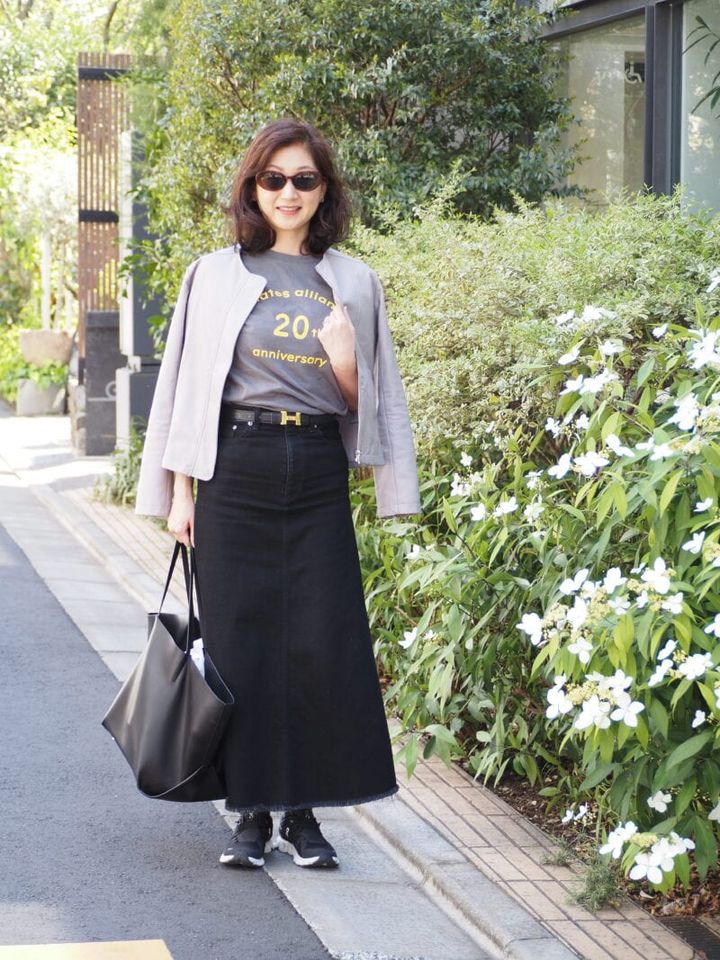 グレーのTシャツに黒のロングスカートを合わせ、シンプルながらも洗練されたモノトーンスタイルに。ウエスト位置が高めのAラインシルエットを選ぶことで、スタイルアップ効果も抜群! 足元はスニーカーではずしつつ、ジャケットをさらりと肩掛けしてこなれ感ときちんと感を融合。