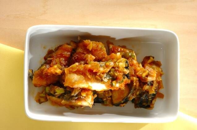 別鍋で作ったトマトソースに、フライパンで焼き色をつけた塩サバを入れる、あっさりとしたトマト煮。サバをほぐしてトマトソースにするのもおすすめです。
