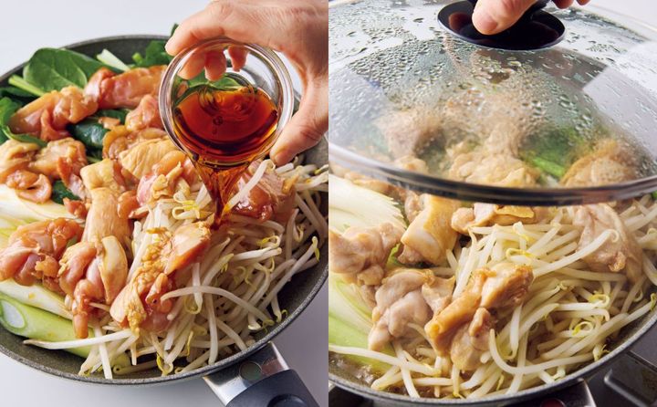 (3)(1)の鶏肉を漬け汁ごとのせ、〈B〉をかけてふたをし、中火にかける。煮立ったらそのまま5分煮る。
