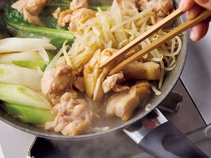 そこで今回は、一日350gを無理なく達成すべく、一食で目標値の1/2量の野菜がとれる『小松菜、もやし、ねぎと 鶏肉のすき煮風』のレシピをご紹介。これ一品で、緑黄色野菜60g、淡色野菜150gの摂取が可能に。さっそく試してみて!