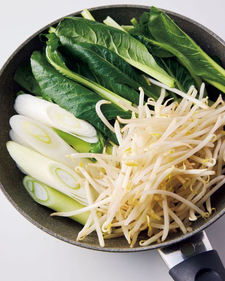 (2)フライパンに小松菜、もやし、ねぎを分けて入れ、全体に広げる。