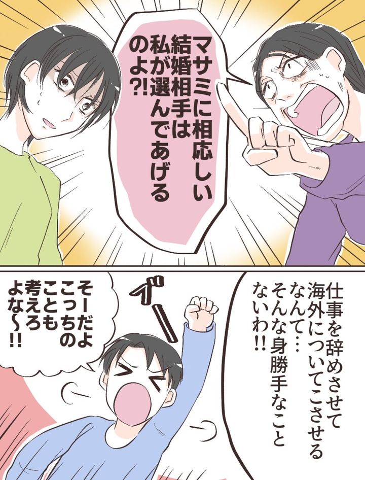 「マサミに相応しい結婚相手は私が選んであげるのよ!?仕事を辞めさせて海外について来させるなんて・・そんな身勝手なことないわ!!」お母さんがそう言うと、「そーだよ!こっちのことも考えろよな~!!」カズキさんも同調します。