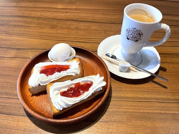 トーストのモーニングはたくさんありますが、ホイップクリームをトッピングしたものはあまり見かけないですよね。イチゴジャムとクリームという王道の組み合わせなのでおいしさも間違いありません。