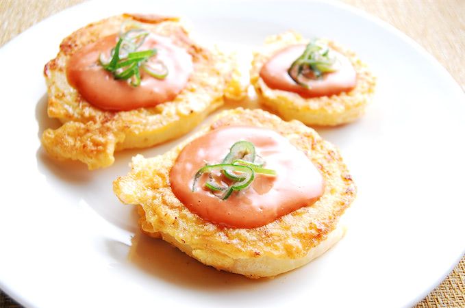 5. 爪楊枝を外して、お皿に盛り付けます。マヨネーズとケチャップを混ぜたオーロラソースを塗り、小口切りにした青ねぎ(分量外)を散らせば出来上がり。