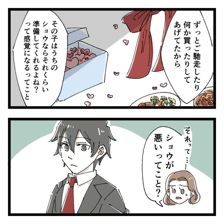 「ずっとご馳走したり、何か買ったりしてあげてたから、その子は『ショウならそれくらい準備してくれるよね?』って感覚になるってこと」お父さんにそう言われて、「それって・・ショウが悪いってこと?」と不安そうにたずねるお母さん。