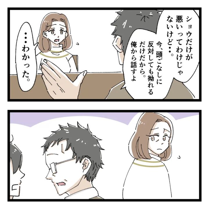 「ショウだけが悪いってわけじゃないけど・・。今、頭ごなしに反対しても拗れるだけだから。俺から話すよ」お父さんの言葉に、「・・わかった」お母さんも納得することに。