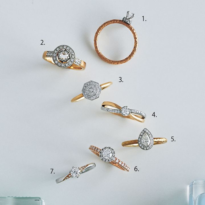 1.表情のあるアームに輝くダイヤモンド。台座の側面には贅沢なパヴェを施して。「プリンチペッサ」〈PG×Pt×D〉¥220,000(シンティランテ/バーニーズ ニューヨーク銀座本店) 2.センターストーンを囲むパヴェ、緻密なアームの装飾など、地金の印象も相まってアンティーク調に。「エドワー ディアン」〈Pt×YG×D〉¥385,000(アガット) 3.ダイヤモンドをパヴェ状にあしらって。幸運を引き寄せる八角形のフォルムも印象的。「インディアン インスピレーション」〈YG×WG×D〉¥203,500(マリハ) 4.無限の愛を表すインフィニティをモチーフに。「ウィッシュ アポン ア スター」〈Pt× YG×Dセンター0.13ct〉¥198,000(フェスタリア ビジュソフィア) 5.ダイヤモンドの存在感を高めるペアシェイプ。「ゴッチャ」〈Pt×YG×D〉¥34 1,000(シンティランテ/バーニーズ ニューヨーク銀座本店) 6.贅沢なきらめきもスタイリッシュに。「アクアクラウン」〈Pt×PG×Dセンター0.25ct〉¥418,000(4℃/エフ・ディ・シィ・プロダクツ) 7.最愛の人へ贈る、ロマンティックなエンゲージメントリング。「ティアラ ガーデン~ハニー ビー~」〈Pt×YG×Dセンター0.2ct〜〉¥324,500〜(サマンサティアラ/サマンサティアラ 新宿タカシマヤ店)