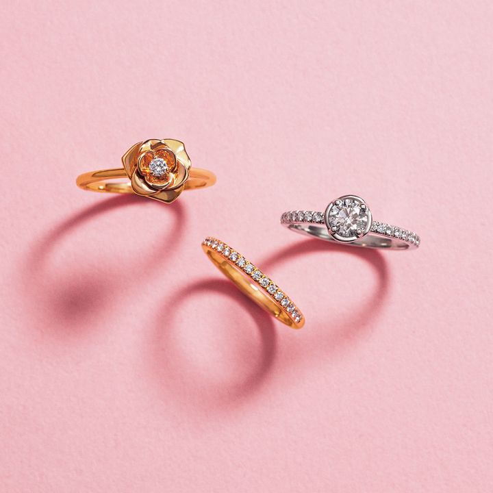 1960年代以降、ピアジェで最も用いられているモチーフのひとつ。つぼみから大輪のバラが花開く、その一瞬を象ったエンゲージメントリングは、洗練された甘美なムード。リング・右上「ピアジェ ローズ」〈Pt×Dセンター0.25ct〜〉¥906,400~左上〈PG×D〉¥305,800下「ピアジェ ライムライト」〈RG×D〉¥310,200(すべてピアジェ/ピアジェ コンタクトセンター)