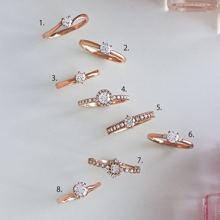 1.優美なウェーブラインのソリテール。リング〈PG×D0.15ct〜〉¥191,400〜(ニナ リッチ/エスジェイジュエリー) 2.4つ爪のエンゲージメントリングの台座には、ダイヤモンドをセッティングした“クロッシングスター”が。「クロッシング スター」〈PG×D0.25ct〜〉¥355,300〜(スタージュエリー/スター ジュエリー銀座店) 3.水面に落ちる瞬間のしずくが描く、水の王冠。その瞬間と偶然に、ふたりが出会った奇跡を投影して。「アクアクラウン」〈PG×D0.2ct〉¥264,000(4℃/エフ・ディ・シィ・プロダクツ) 4.気品漂うエンゲージメントリングの定番。「ヴァンドーム グレース」〈PG×Dセンター0.2ct〜〉¥341,000〜(ヴァンドーム青山/ヴァンドーム青山プルミエール 伊勢丹新宿店) 5.ローダンセの花言葉は“変わらぬ思い”。「ローダンセ」〈PG×Dセンター 0.25ct〜〉¥358,600〜(CHARMY/CHARMY横浜元町本店) 6.一面に広がるバラ園をイメージしたデザイン。「ロズレ」〈PG×Dセンター0.2ct〜〉¥221,100〜(ルシエ/ルシエ 銀座本店) 7.プリンセスカットにも、アームにも…贅沢にダイヤモンドを散りばめて。リング〈シャンパンゴールド×Dセンター0.18ct〜〉¥462,000〜(アベリ) 8.自然をモチーフに、緩やかな曲線を描く。「ネイチャーコレクション」〈シグネチャーゴールド×D〉¥452,000(acredo Ginza)