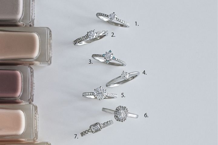 1.憧れを形にしたような4つ爪のクラシックなエンゲージメントリング。「フォーエバーマーク ブライダル コレクション フォーエバーマーク セッティング® ソリティア パヴェ リング」〈Pt×Dセンター0.2ct〜〉¥403,700〜(デビアス フォーエバーマーク) 2.重なり合う、美しい羽のよう。「フェザー」〈Pt×Dセンター0.2ct〜〉¥314,600〜(スタージュエリー/スタージュエリー銀座店) 3.クリアブルー ダイヤモンドが引き立てるまばゆい輝き。「シリウス」〈Pt×Dセンター0.2ct〜×ブルーD〉¥270,600〜(CHARMY/CHARMY横浜元町本店) 4.シンプルなストレートラインに心惹かれて。「ロイヤル・アッシャー・カット プラチナ ダイヤモンドリング」〈Pt×D0.3ct〜〉¥502,700〜(ロイヤル・アッシャー/ロイヤル・アッシャー・オブ・ジャパン) 5.フランス語で“真実”、その清廉な輝きがふたりの想いとリンクして。「ラヴェリテ リング」〈Pt×Dセンター0.2ct〜〉¥341,000〜(アーカー/アーカー 表参道ヒルズ店) 6.繊細なフォルムの中に、凛と佇むエメラルドカットダイヤモンド。「ヴァンドーム グレース」〈Pt×Dセンター0.3ct〉¥440,000〜(ヴァンドーム青山/ヴァンドーム青山プルミエール 伊勢丹新宿店) 7.上品なエメラルドカットダイヤモンドに、細かい粒を打刻したアンティーク風のデザイン。「ミルアモーレ」〈Pt×Dセンター0.25ct〜〉¥357,500〜(ポンテヴェキオ/ポンテヴェキオ ブライダル 銀座並木通り本店)