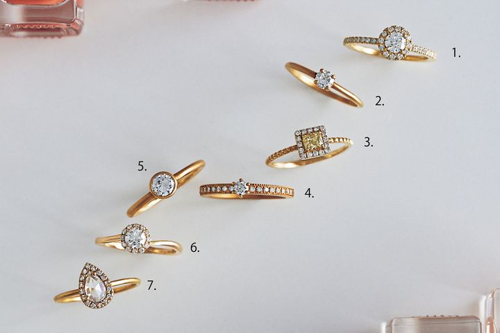 1.光をより多く取り込む構造で華やかに輝くきらめきに魅了されて。「ヴィヴィアン ブリリアン エンゲージメント リング」〈YG×Dセンター0.2ct〜〉¥341,000〜(アーカー/アーカー 表参道ヒルズ店) 2.シンプルで偽りのない、愛のメッセージ。「シンシア」〈YG×D〉¥192,500(KAORU/KAORU 阪急百貨店うめだ本店) 3.スクエア型のダイヤモンドと、華奢で立体的なアームのエキゾチックなバランス。「ヒスパニア」〈YG×D×イエローD〉¥198,000(ジジ/ホワイトオフィス) 4.温かみのある地金と繊細なダイヤモンドの組み合わせ。「トワエモア」〈YG×D〉 ¥242,000(アガット) 5.ミニマルなデザインがダイヤモンドの存在感を引き立てる。「永久の願い」〈YG×D0.15ct〉¥240,900〜(マリハ) 6.太陽の周りに出現する光の輪のように、センターダイヤモンドがより高貴に輝いて。「ヘイロー」〈YG×Dセンター0.2ct〜〉¥314,600〜(スタージュエリー/スタージュエリー銀座店) 7.純白の花びらのような、ペアシェイプのダイヤモンド。「サフィード」〈YG×YGプレーティング×D〉¥176,000(アルティーダ ウード)