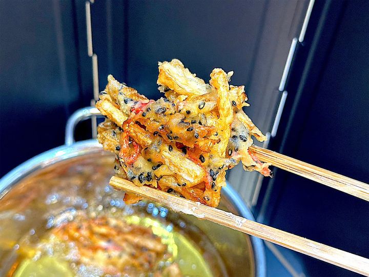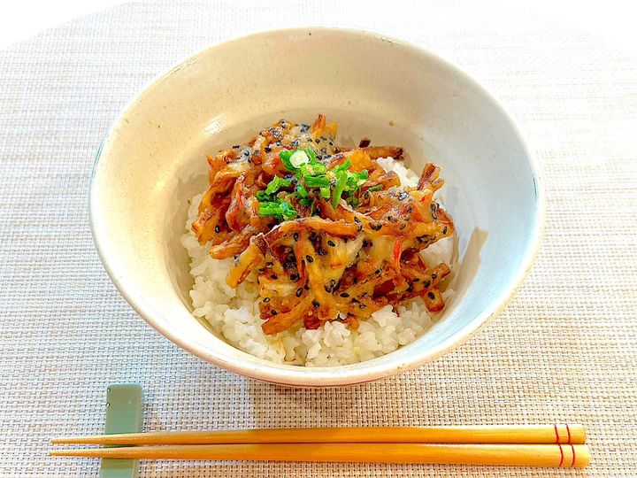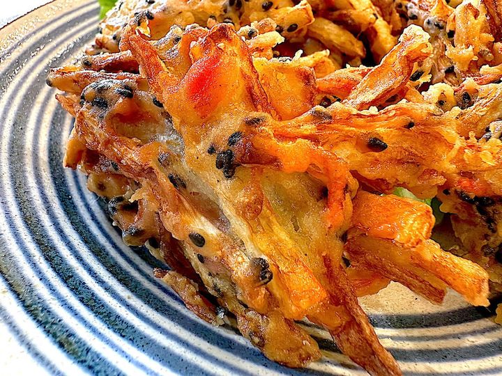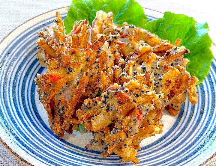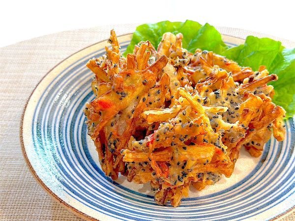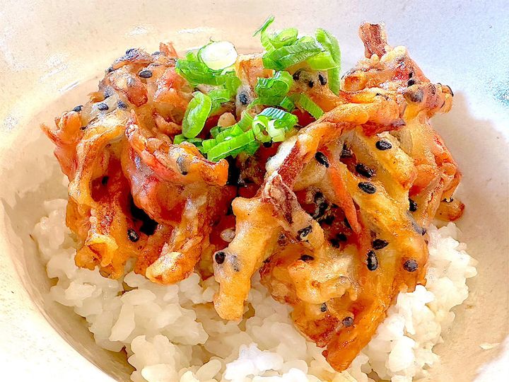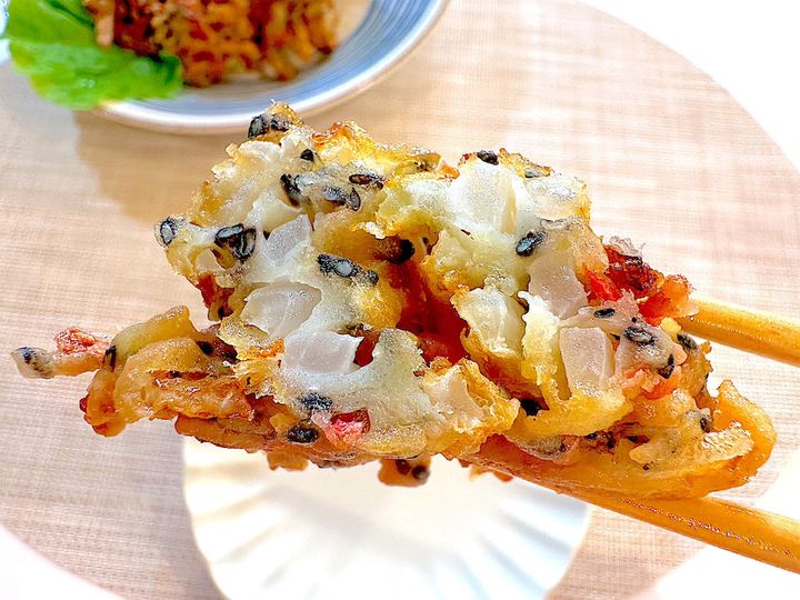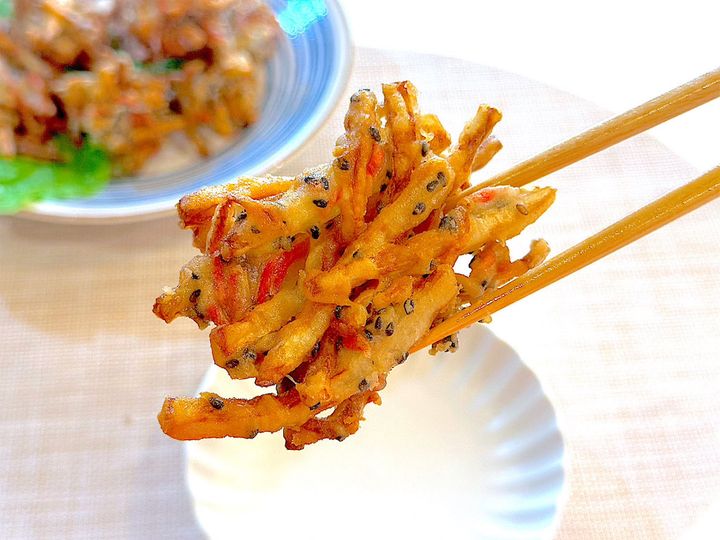 米粉入り天ぷら粉で揚げたことにより、いつものかき揚げよりもサクサク感が格段にアップしている!