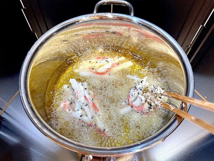 5. 30秒ほど触らずに火を通し、揚げ色がついたら裏返して1分30秒ほどカラッとなるまで揚げる。