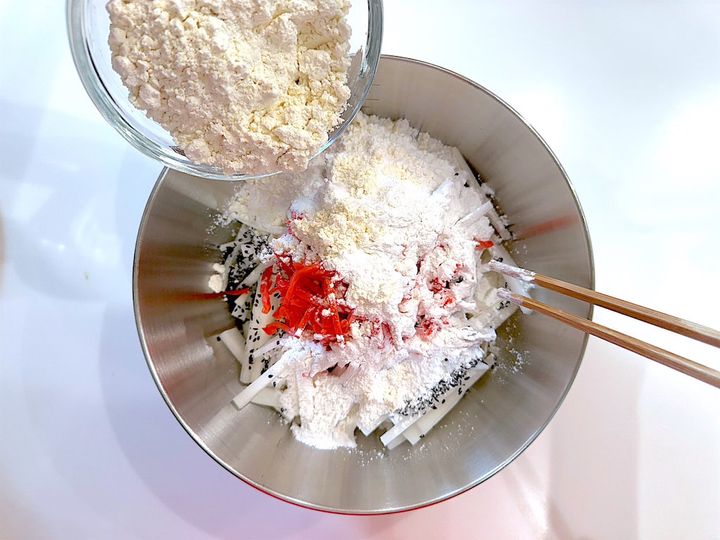 2. ボウルに1の大根、紅生姜、黒ゴマ、米粉入り天ぷら粉を入れて混ぜる。