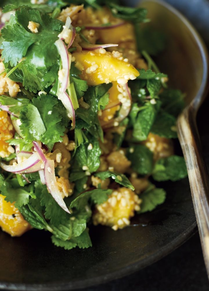 濃密なマンゴーの甘さと、こんがり炒めたひき肉、フレッシュなハーブ、ナンプラーが調和し、後を引く味わいに。