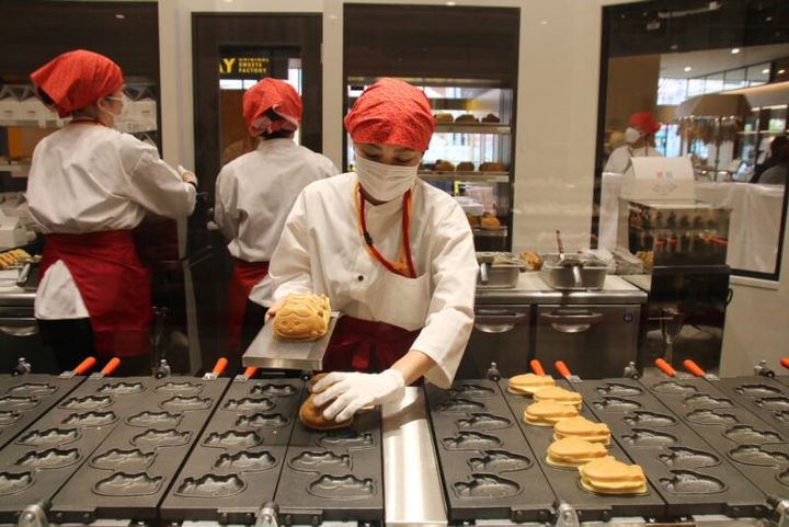 嬉しいことに、店舗ではスタッフさんたちが実際に「ちいかわ焼き」を焼いている姿をガラス越しに見ることができます。焼きたての「ちいかわ焼き」が次々とこの世に誕生していく尊い瞬間に立ち会えるとは。