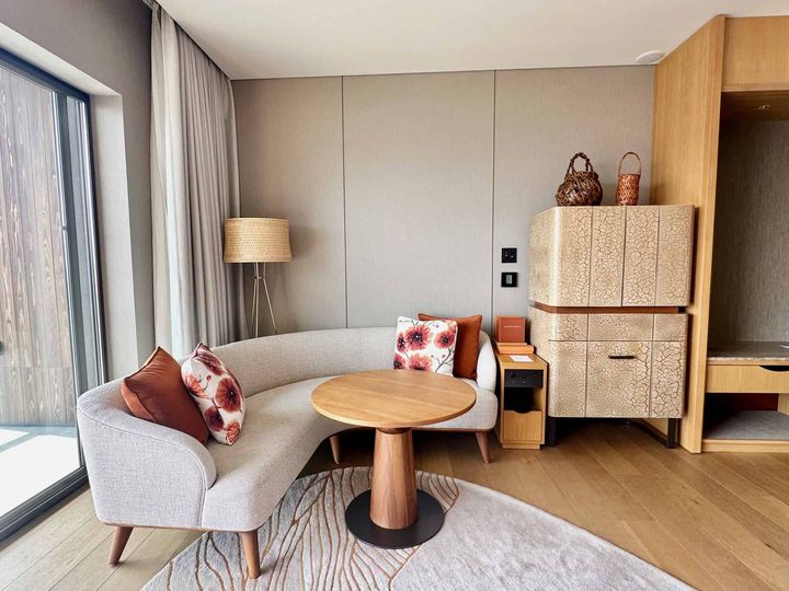 客室はどのタイプも開放的な空間で、竹細工や組子細工などの伝統工芸を曲線にあしらった和のぬくもりあふれるモダンなデザイン。ラグジュアリーな大理石のバスルームには、バスタブと独立したウォークインシャワー、ツインシンクがあり快適に過ごせます。なかでもクラシックティビューの客室は、全面ウィンドウからの景色を楽しめる心地のよい空間。ソファが置かれたた広いテラスから雄大な扇山や星空を眺めながらのんびりと寛げます。