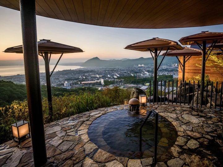 別府石でできた大浴場の露天風呂は、別府湾と市街地を一望できる絶景スポット。