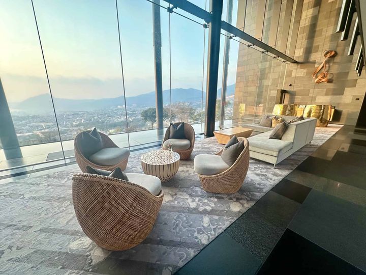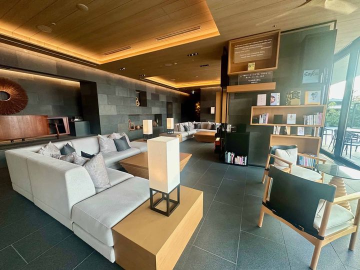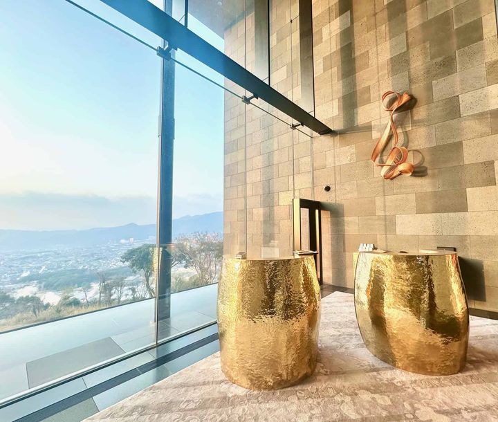 アクセスは大分空港から車で約50分、空港から別府駅までリムジンバスで向かえばホテルまでシャトルバスを利用することもできます。エントランスを抜けると吹き抜けの開放的なロビーが現れ、天井まである正面の大きな窓から別府の街を見渡せます。ソファへ案内され、地元名産のざぼん漬が添えられたTWGのホテル特製ブレンドティーをいただきながら優雅にチェックイン。これから始まるホテルステイに気分が上がります。