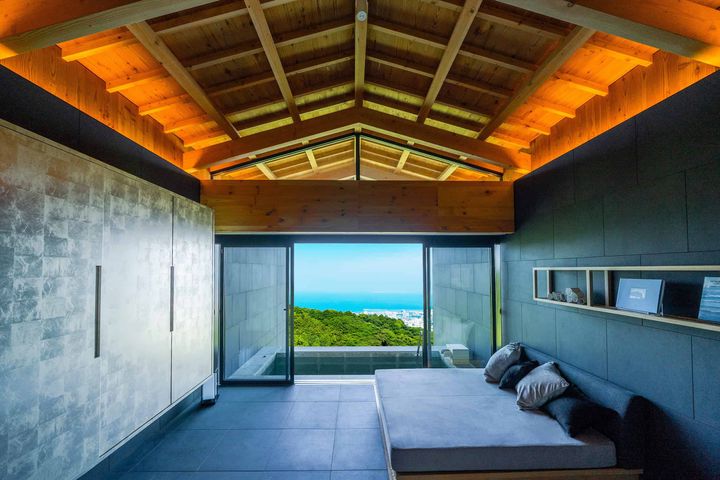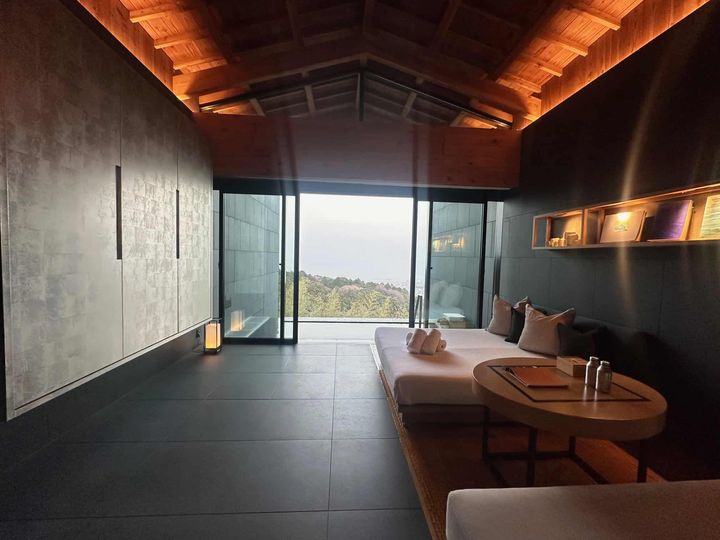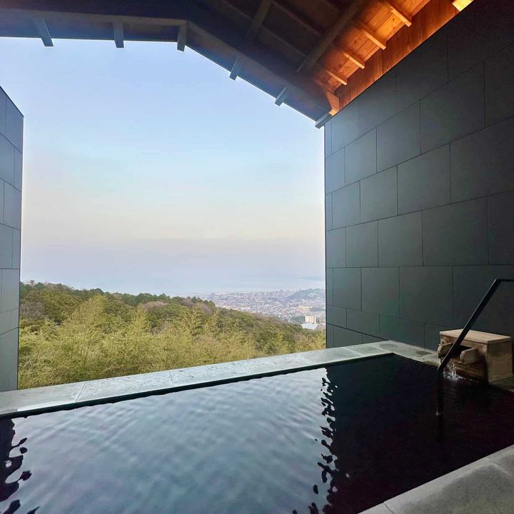 このホテルの魅力は何と言っても温泉!露天風呂の眺望が素晴らしいことで知られていますが、実はプライベート温泉も一推し。離れにある一棟を貸切ることができ、ラグジュアリーな空間で絶景と温泉を独り占めできる贅沢な時間を過ごせます。朝9時から夜9時まで1時間1万円で予約でき、最大6名まで利用可能。モダンなベッドルームとバスルームが備わっており、バスアメニティやバスローブもあります。