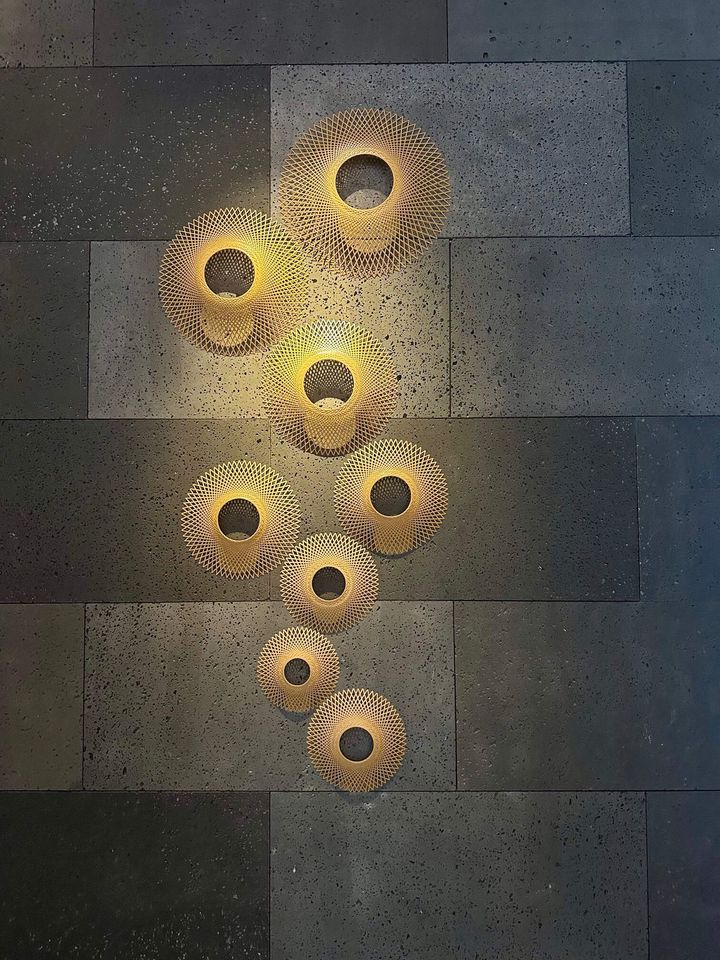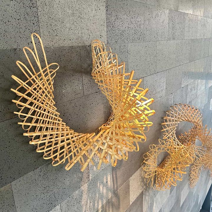 中臣一(なかとみ はじめ)氏による竹細工は、見る時間帯や光の角度によって陰翳が変化する繊細な美しさ。