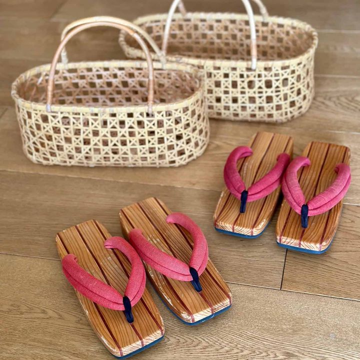 温泉へ行く時に使う日田市の虹彩杉を使用した下駄と、別府名産の竹細工の湯カゴ。別府にちなんだデザインの浴衣もあります♪