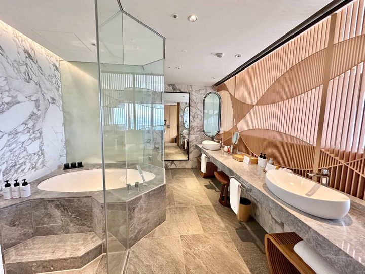 バスルームは、ツインシンクのパウダースペースや大きなバスタブ、独立したウォークインシャワーがある贅沢な仕様。