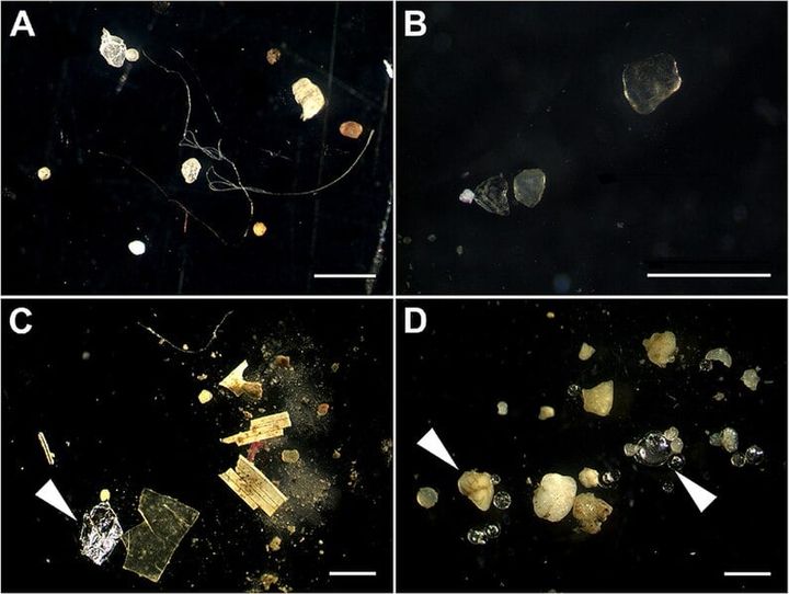 ドイツの河川の堆積物に含まれているマイクロプラスチック(白色のバーは1mmを示す) / Credit:Wikipedia Commons