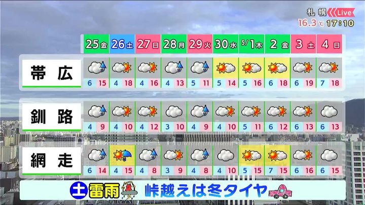 土曜の午後はオホーツク海側や山沿いでにわか雨のおそれがあります。日曜は網走で雨が降り、山沿いでは雪がまじります。峠越えは冬タイヤが必要です。