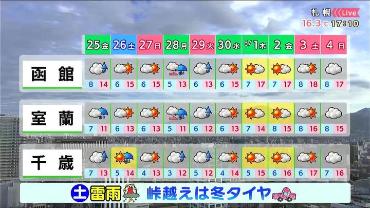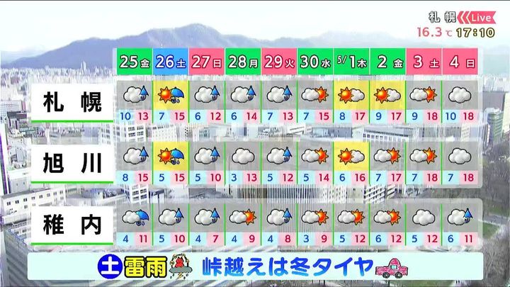 土曜日は晴れ間が出ても午後は雷雨に注意して下さい。日曜も雨で山では雪がまじるでしょう。札幌のお花見は土曜の午前か、寒くなりますが日曜の午後がオススメです。