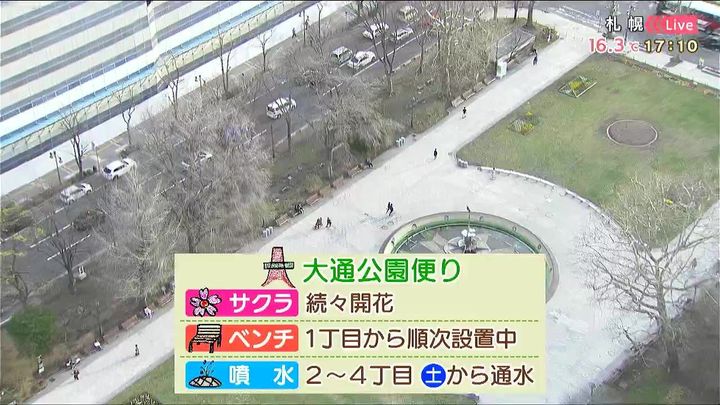 きょう24日(木)は外に出たくなる陽気でした。ここで大通公園便りです。公園内のサクラは続々と開花し、ベンチも順次設置中です。そして、2丁目から4丁目の噴水が26日(土)から始まります。連休中も屋外のレジャーにも気になる天気。