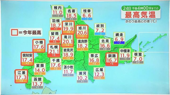 各地のきょう24日(木)の最高気温です。日本海側で赤枠、ことし一番暖かくなりました。札幌は21.1度、旭川は20.6度でした。東風が吹いて、日本海側では山を越えて暖かい空気が吹き下りるフェーン現象の影響で気温が上がりました。一方、東風で海からの冷たい風が吹く根室や網走、紋別などは一ケタの寒さでした。地域によって差が大きく、北海道は広いですね。