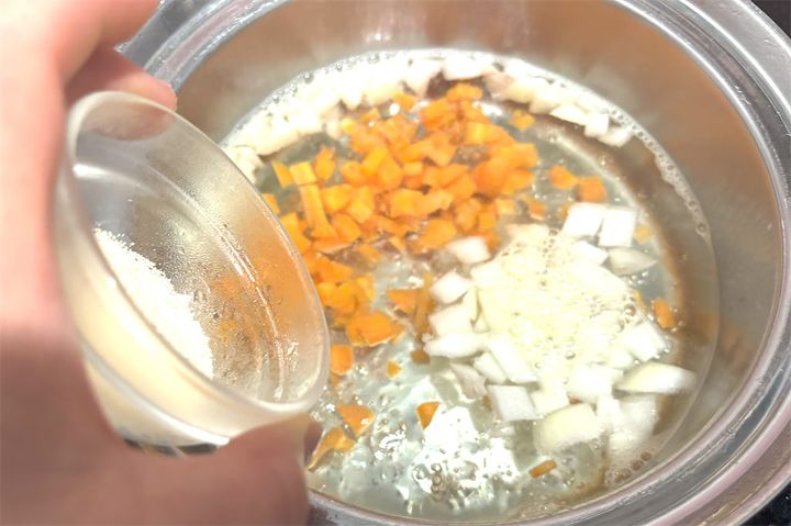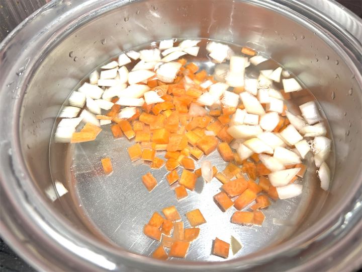 鍋にお湯800ml(分量外)を沸かし、1のさいの目切りにした玉ねぎ、にんじんを入れて煮ます。