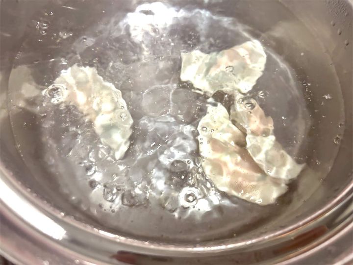 4とは別の鍋にたっぷりの湯(分量外)を沸かし、5の包んだものを茹でます。