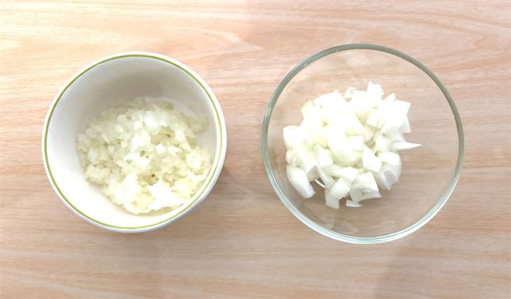 玉ねぎは下の画像のように、半量をさいの目切り、残りの半量をみじん切りにします。
