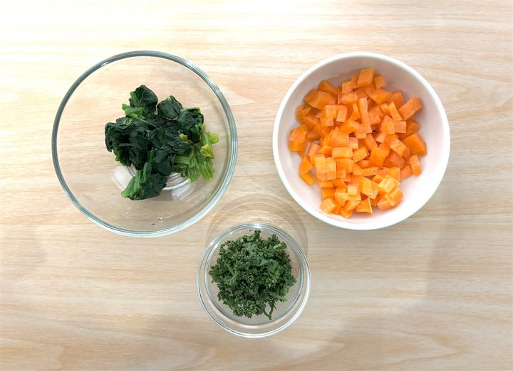 下の画像のように、にんじんはさいの目切り、ほうれん草はさっと茹でて細かく切り、パセリはみじん切りにします。