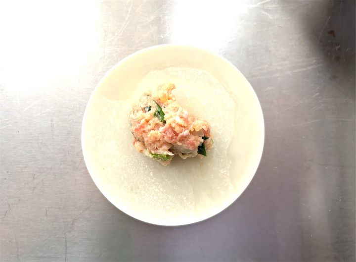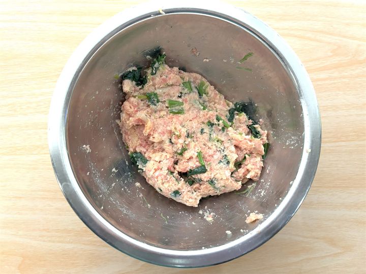 そこへ1のほうれん草を加えて混ぜ合わせたら、マウルタッシェンの「たね」は完成です。