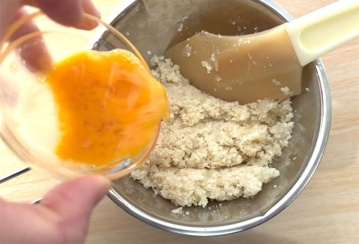 玉ねぎの粗熱が取れて、よく混ぜたものに卵を加えてさらに混ぜます。