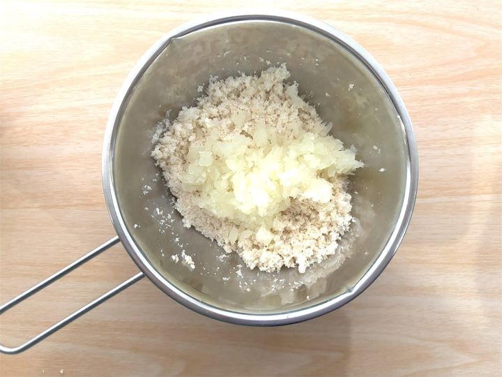1の玉ねぎのみじん切りを耐熱容器に入れてラップをかけ、電子レンジ500Wで約2分加熱して、パン粉と牛乳を混ぜたものに合わせます。