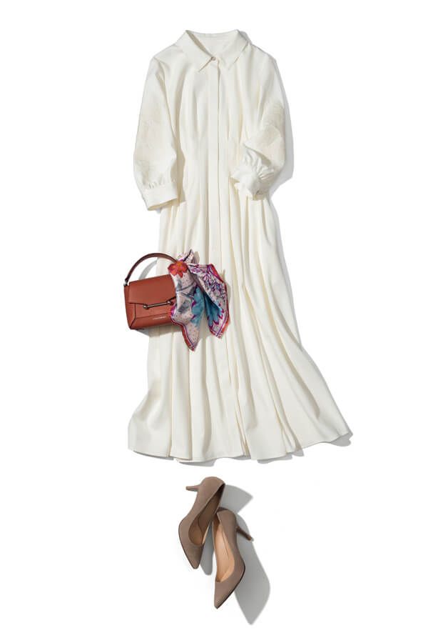 正統派白シャツワンピを+花柄スカーフで表情豊かに
